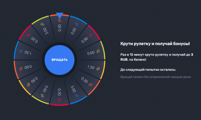 Второй бонус без депозита игроки могут получать аж каждые 15 минут! Да! Вы не ослышались, каждые 15 минут вам будет доступно вращение в колесе, в котором может выпасть до 3 рублей.